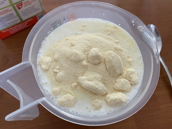 - Mélanger le lait avec le lait en poudre. Laisser reposer pendant 5 minutes puis fouetter jusqu’à ce que le lait en poudre soit dissous.