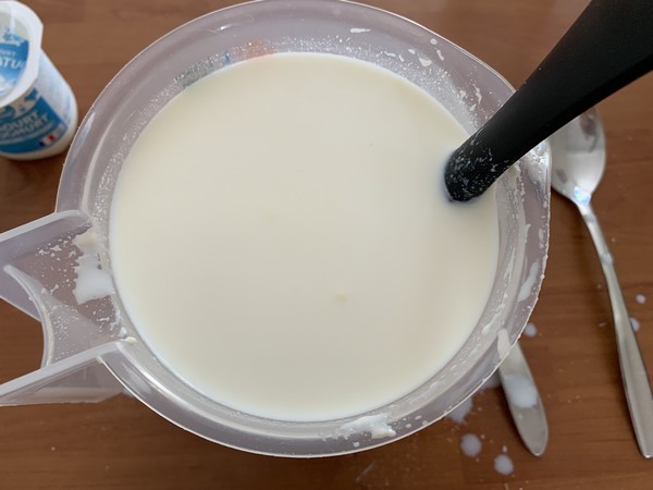 - Verser le yaourt dans un récipient, y incorporer un peu de lait puis ajouter le reste. Mélanger jusqu’à ce que l’ensemble soit bien lisse.