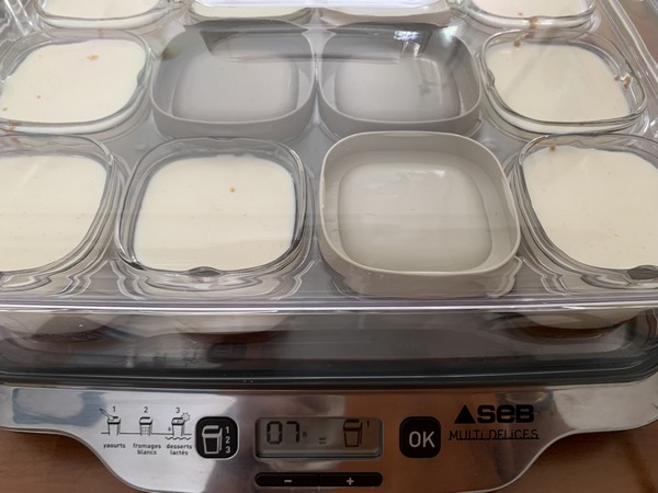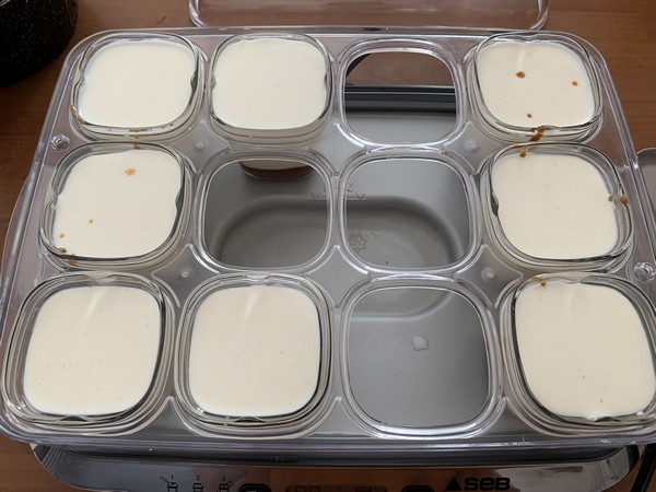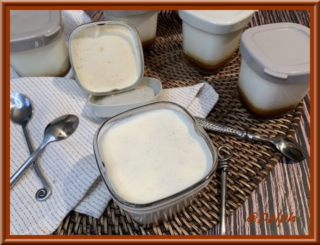 - Verser dans les pots sur le caramel et faire prendre sans les couvercles en yaourtière pendant 7 heures.
