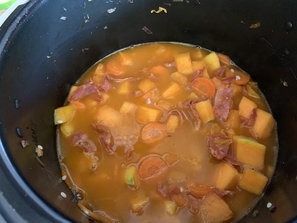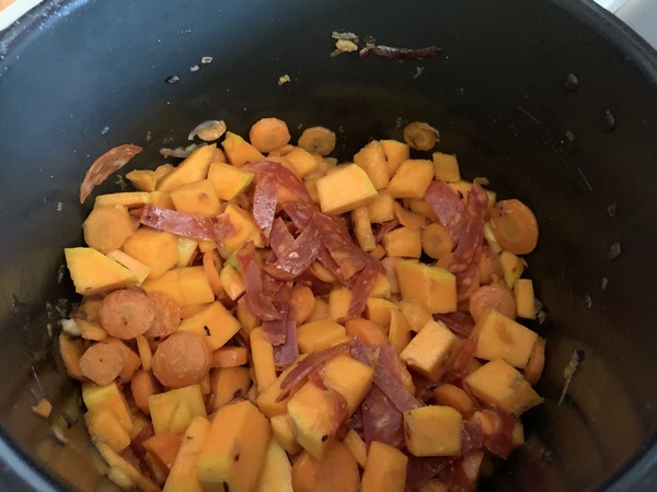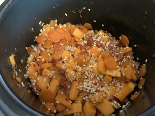 2. Mettre le Cookéo en mode dorer, déposer le beurre avec l’oignon rouge et le gingembre, mélanger laisser dorer 1 minute, ajouter les carottes et le cumin, mélanger à nouveau et laisser dorer 1 minute. Ajouter vos dés de courge avec les lanières de chorizo, mélanger et laisser dorer 1 minute.