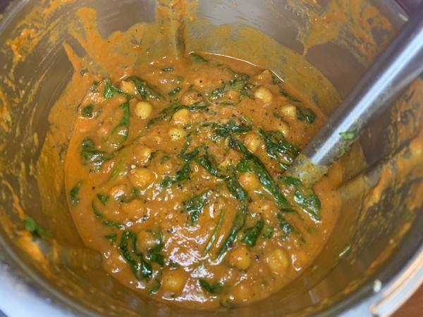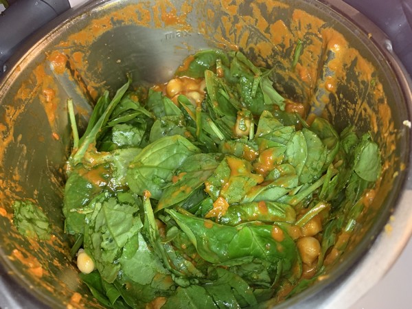 - Ajouter les pois chiches, les épinards, mélanger avec la spatule et cuire 10 min/100°C/couteau inversé/Vit mijotage.