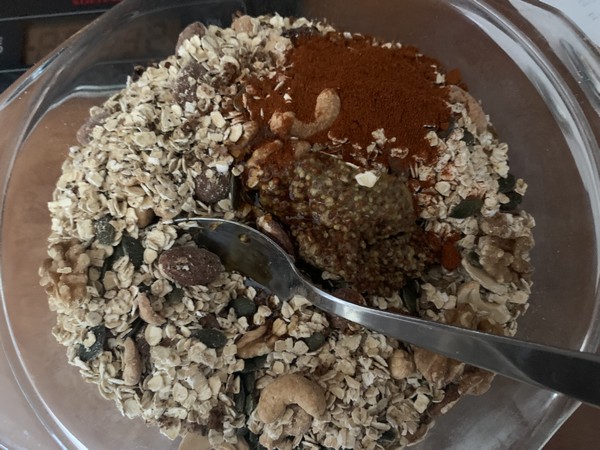 - Dans un récipient mélanger les flocons d’avoine, le paprika, les graines, la moutarde, le miel, l’huile, assaisonner à votre goût bien mélanger le tout.