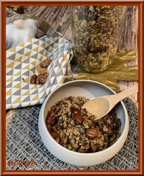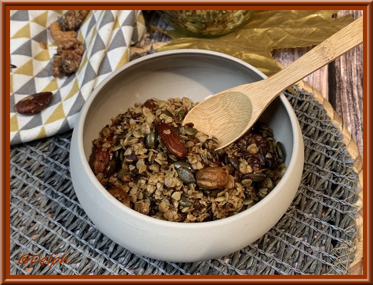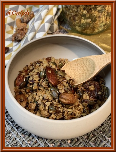 Bonjour chère Delphine ton granola m’inspire j’ai toutes ces graines chez moi. J’ai bien.envie de le tenter mais version sucrée enfin quand je dis sucré c’est à ma manière sans bien sur.du sucré alternatif sirop d’agave ou.sirop 🍁 d’érable .Si je le fait je te le dis.