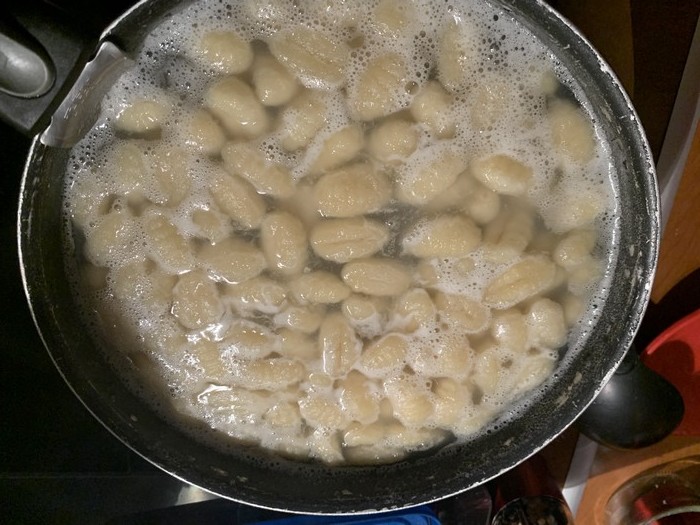 - Dans une casserole d’eau bouillante, faire cuire les gnocchi jusqu’à ce qu’ils remontent à la surface.