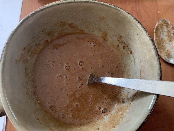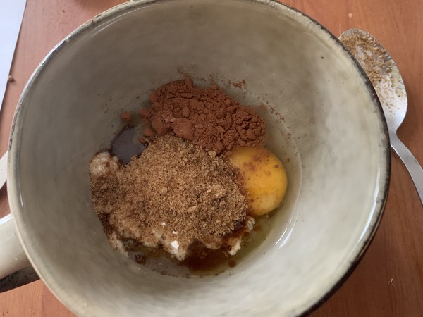 - Dans un ramequin (ou dans un bol) battre l’œuf, ajouter la compote, la levure chimique , le cacao et le sucre.