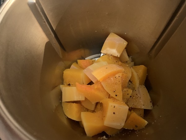 - Mettre les cubes de la courge dans le panier vapeur du Cookéo, puis mettre de l’eau jusqu’à hauteur du trépied puis mettre en cuisson sous pression pour 10 minutes. Egoutter la courge puis transférer dans le bol du Thermomix, mixer 30sec/vit 6 , racler les bords, assaisonner avec du sel, poivre et l’huile de noix et mixer à nouveau 10sec/vit5. Garder au chaud.