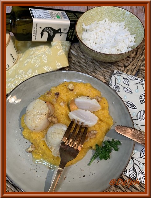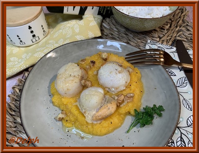 - Disposer la purée de butternut sur les assiettes chaudes, déposer les noix de Saint-Jacques, parsemer de fleur de sel et d’un peu de noix hachées.