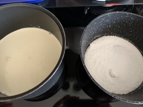 2. Chauffer la crème et le lait à frémissement. Réserver au chaud.