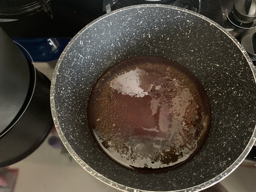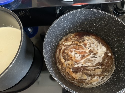 3. Verser le sucre peu à peu dans une casserole de taille moyenne. Faire chauffer jusqu’à ce que vous obteniez un caramel foncé. (Attention ne jamais mettre de cuillère dans le caramel, faire tourner doucement votre casserole sur votre plaque.