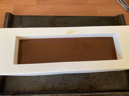 6. Placer votre moule à insert sur une plaque et verser le caramel dedans. Laisser reposer 20 minutes puis congeler au moins 3 heures.