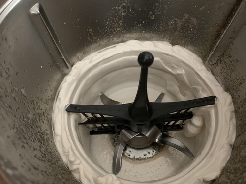 3. Puis, par le trou du couvercle, verser le chocolat fondu qui doit être à 35°C en fouettant 1min/vit3.