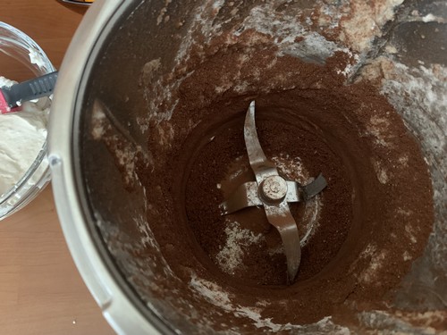 2. Mettre à la place les noix de pécan et le sucre glace, puis mixer 10sec/vit10, ajouter le cacao et mixer 10sec/vit6.