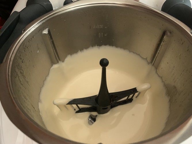2. Verser les œufs, le jaune et le sucre dans votre bol puis faire chauffer 6 min/70°/Vit3 avec le fouet, puis programmer 10 min/Vit 4 toujours avec le fouet, avec le panier cuisson à la place du gobelet pour éviter les projections.