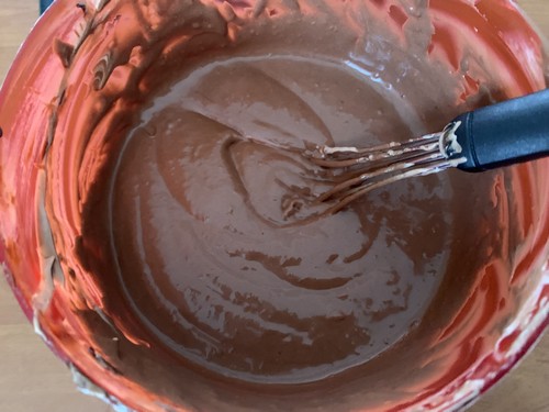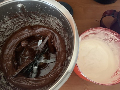 4. En parallèle monter la crème liquide en crème fouettée (j’utilise mon Speedy chef). Mélanger la crème fouetté et la préparation au chocolat avec un fouet. (J’ai préféré le faire au fouet pour éviter que ma crème ne retombe).