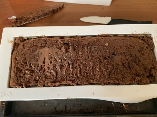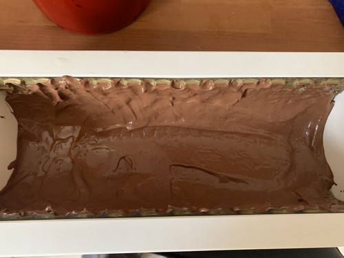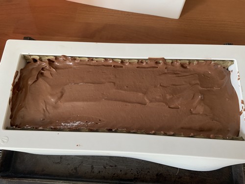 4. Lisser et placer le biscuit au chocolat taillé à la bonne dimension du moule.