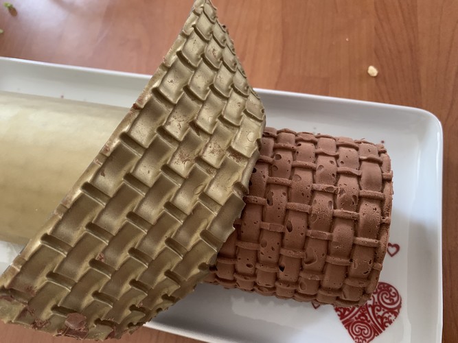 9. Prendre le moule pour embout de bûche. Appliquer du colorant alimentaire doré au pinceau si vous le souhaitez.