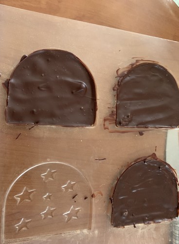 10. Lisser avec une petite spatule métallique coudée, de façon à égaliser tout le chocolat, de sorte qu’il arrive au bord des empreintes.