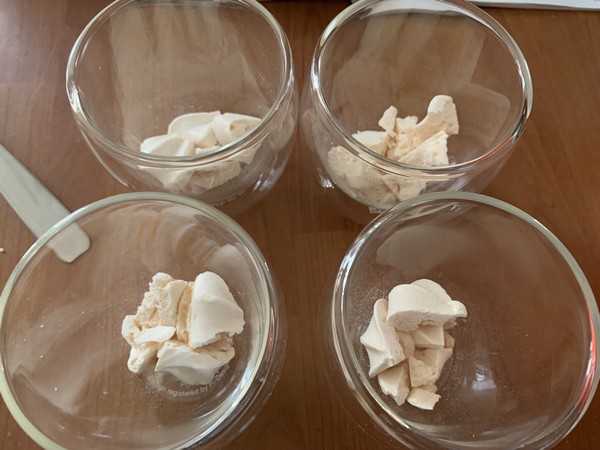 - Emietter un peu de meringue dans le fond de 4 verrines, mettre une couche de chantilly, puis 1 cuillère à soupe de crème de marron, et refaire une couche de chaque à nouveau, émietter un peu de meringue, mettre un peu de chantilly puis de la crème de marron. Finir avec une touche de chantilly puis parsemer quelques brisures de marrons glacés.