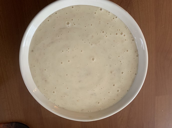 - Dans un petit saladier, mettre la banane écrasée, le skyr , la farine d’avoine, l’œuf, le miel et le lait.