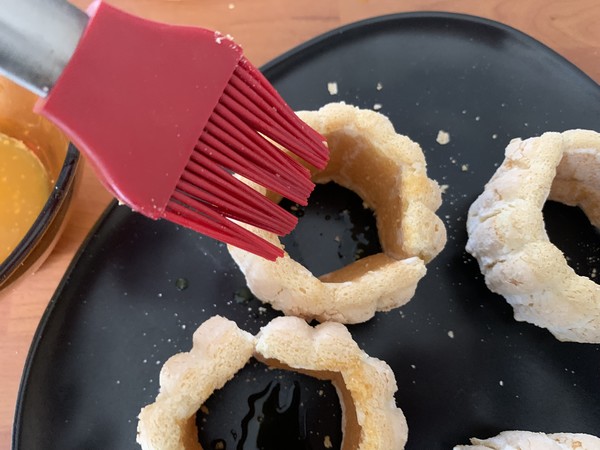 2. Ouvrir le fruit de la passion et à l’aide d’une passoire, récupérer le jus, puis à l’aide d’ide d’un pinceau en tapisser légèrement les parois intérieures des charlottes. Réserver quelques graines pour la décoration.