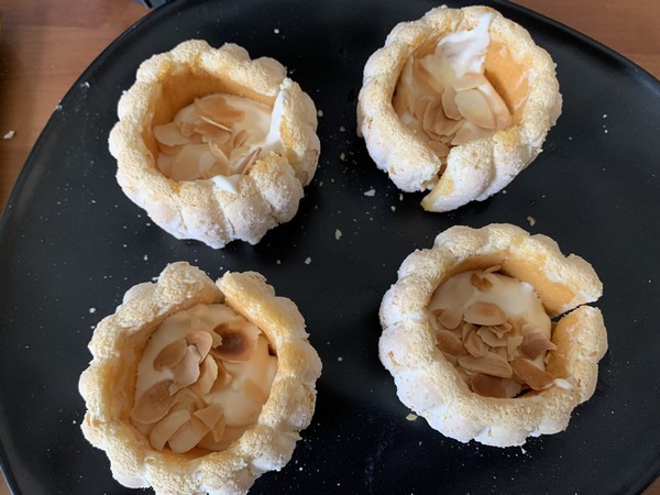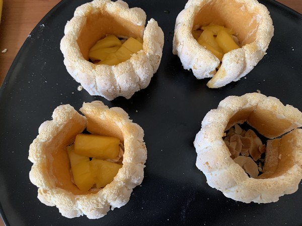 7. Mettre une couche d’amande dans le fond des charlotte ou des verrines, déposer une couche de dés de mangue, puis une couche de crème, remettre des amandes, des dés de mangue puis une dernière couche de crème.