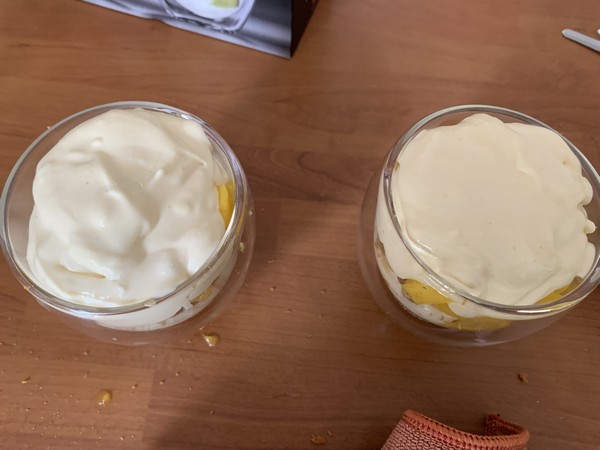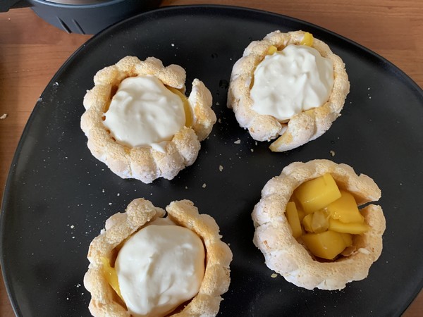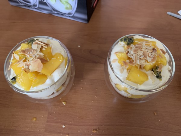 6. Mettre une couche d’amande dans le fond des charlotte ou des verrines, déposer une couche de dés de mangue, puis une couche de crème, remettre des amandes, des dés de mangue puis une dernière couche de crème.