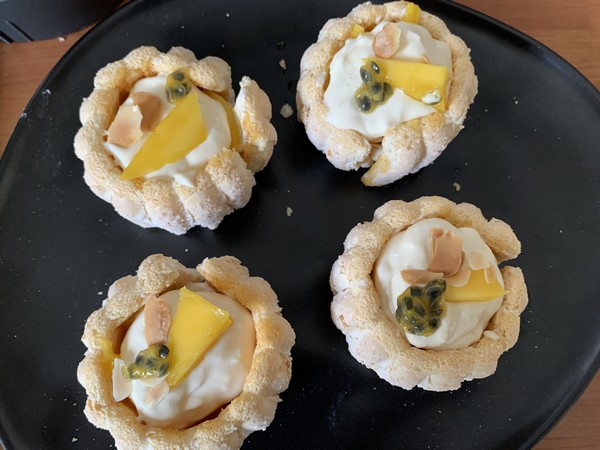 7. Décorer avec un petit bout de mangue, quelques grains de fruits de la passion, des amandes et de la menthe.