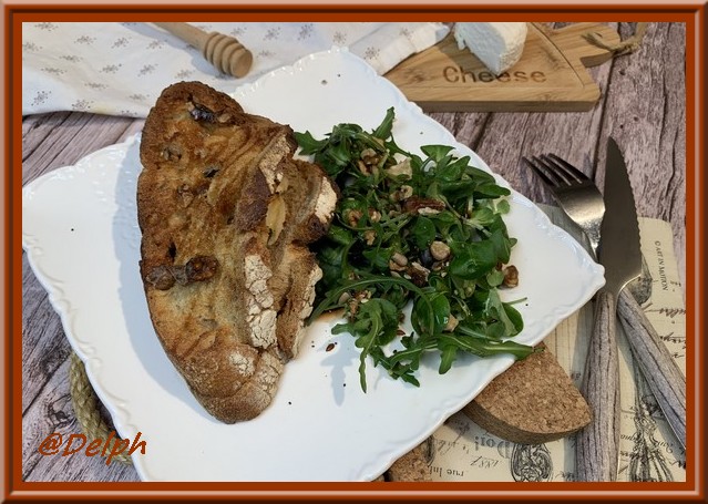 - Sur une tranche de pain de campagne, déposer votre moitié de crottin coupé en lamelles, verser votre filet de miel, puis déposer des cerneaux de noix grossièrement concassés et quelques feuilles de mâche.