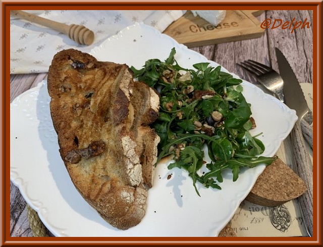 - Sur une tranche de pain de campagne, déposer votre moitié de crottin coupé en lamelles, verser votre filet de miel, puis déposer des cerneaux de noix grossièrement concassés et quelques feuilles de mâche.