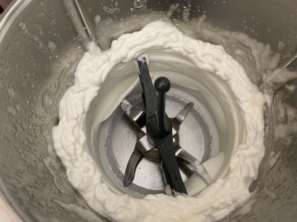 - Séparer les blancs des jaunes d’œufs, mettre les blancs dans le bol, donner un coup de turbo puis insérer le fouet et mélanger 3min/vit4. Réserver.