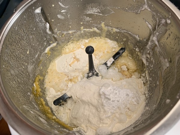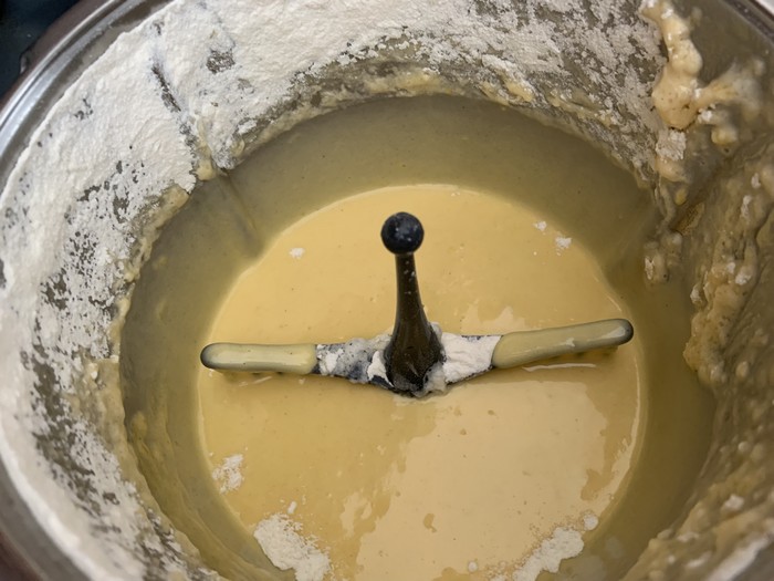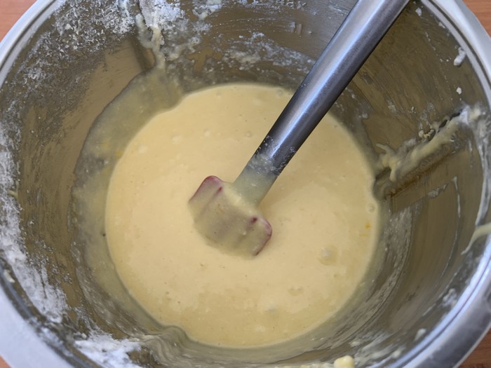 - Ajouter le jus d’orange, la farine, la levure, le beurre et le lait.