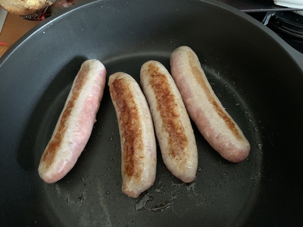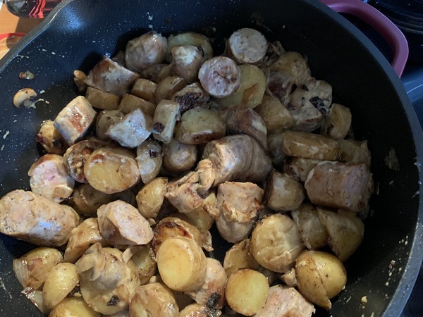 - Dans votre fabuleuse faire dorer les saucisses pendant 15 min environ, les piquer pour laisser leur gras dans votre poêle , puis les réserver avant de les couper en grosses rondelles.