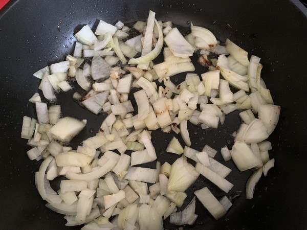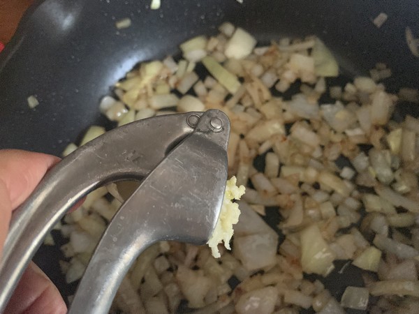 - Eplucher et émincer l’oignon et éplucher également l’ail, dans la même poêle faire revenir l’oignon 5 minutes dans la graisse des saucisses, en mélangeant et ajouter l’ail écrasé, mélanger.