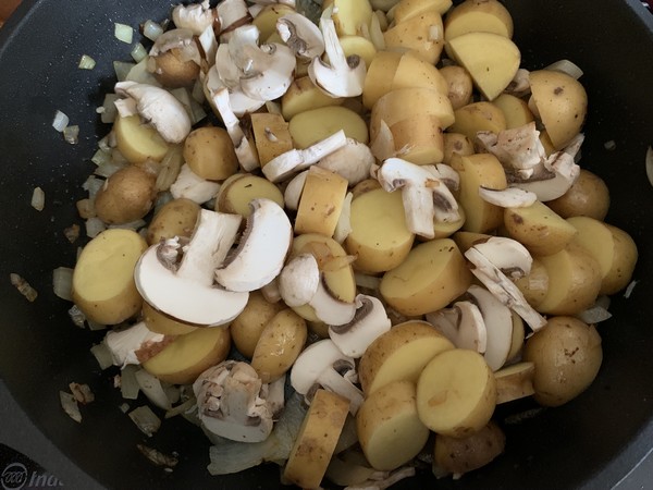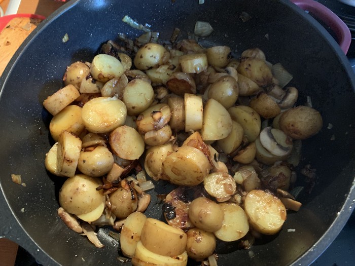 - Incorporer les champignons, nettoyés et coupés en tranches et les pommes de terre, laisser cuire sur feu moyen pendant 25 minutes, à couvert, assaisonner de sel et poivre, remuer de temps en temps, si jamais cela attache ajouter un peu d’eau.