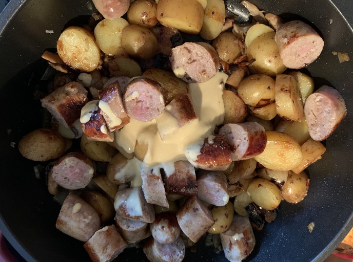 Voici un plat ultra gourmand avec de délicieuses saucisses de Toulouse, revenues avec des pommes de terre grenaille. Et cette crème à la moutarde se marie à merveille avec l’ensemble.