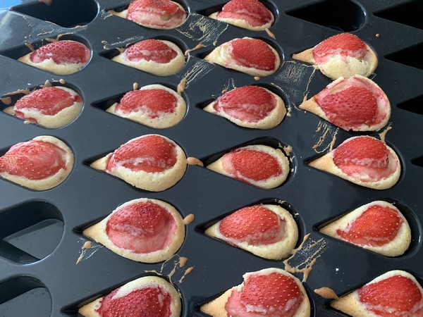 - Verser la pâte dans les empreintes et déposer une demi fraise au centre de chaque empreinte.