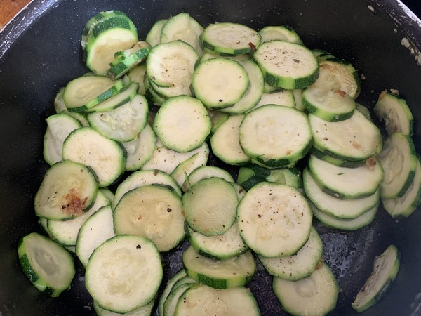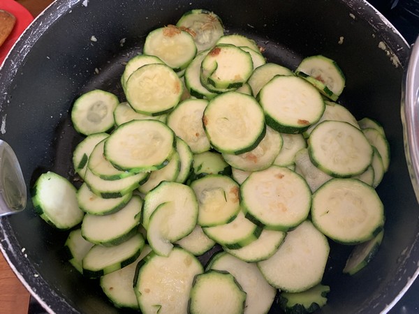 - Eplucher votre gousse d’ail, la hacher, puis dans un wok la faire revenir avec l’huile d’olive, ajouter les courgettes lavées, épluchées et coupées en rondelles, puis à couvert sur feu moyen laisser chauffer environ 25 minutes, remuer de temps en temps.
