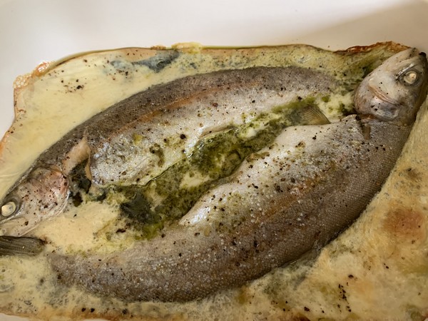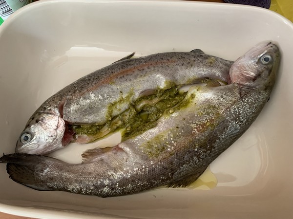 - Laver les truites à l’eau froide puis les sécher. Ensuite, les huiler à l’extérieur et les déposer dans un grand plat à four. les farcir avec la crème de pesto ; saler et poivrer.