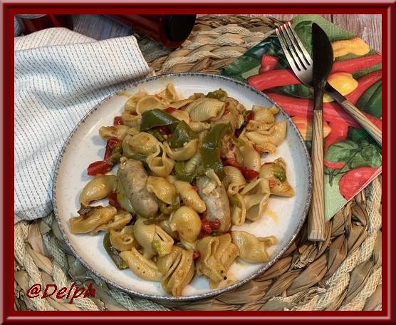 Ma chère Josette que vous pouvez retrouver sur son très joli blog " La cuisine de Josette" est venue tester les pâtes aux poivrons, chipolata et pesto.