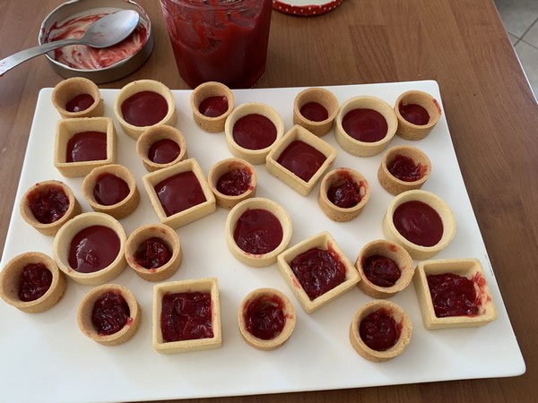 - Déposer vos mini tartelettes sur votre plat de service, puis au fond déposer un peu de confiture, jusqu’à environ la moitié des tartelettes.