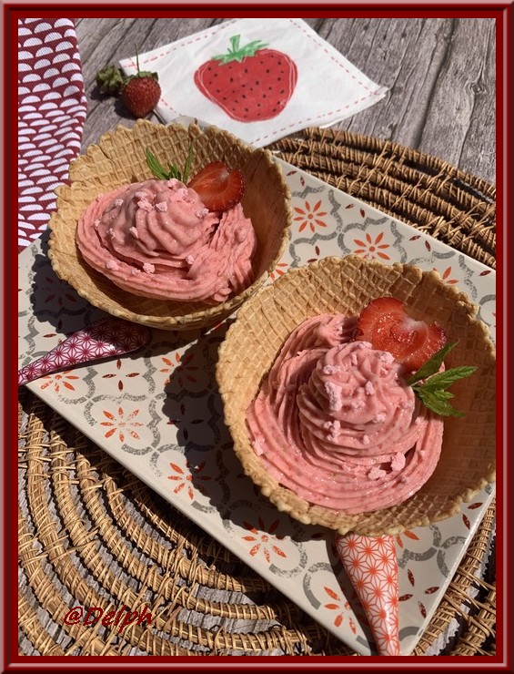 Une délicieuse glace au bon gout de fraises, elle est vraiment très bonne. Je l’ai présentée dans mes coupelles desserts de prêt à garnir, j’ai également utilisé leur poche à douille pour la disposer comme une glace à l’italienne.