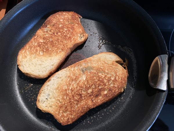 - Dans une grande poêle faire chauffer le beurre et faire dorer les tranches de brioche des deux côtés.