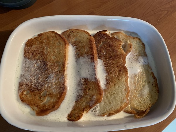 - Disposer les tranches de brioche dans un plat peu profond en les faisant se chevaucher légèrement.