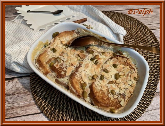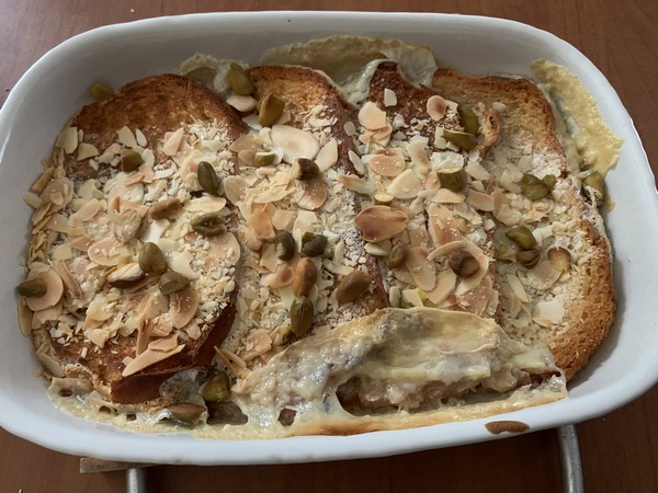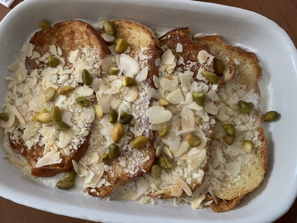 - Verser la crème sur les tranches de brioche, saupoudrer de pistaches et d’amandes et laisser reposer 30 minutes.