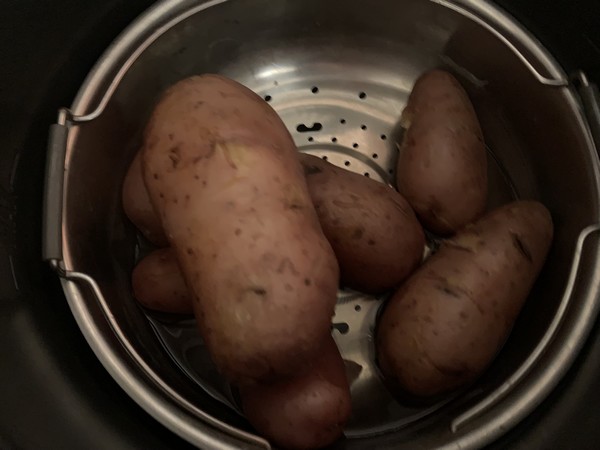- Mettre dans le panier vapeur les pommes de terre lavées puis mettre de l’eau à hauteur du trépied, disposer le panier vapeur puis lancer le mode sous pression pour 14 minutes, égoutter, laisser refroidir puis couper les pommes de terre en fines rondelles.