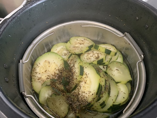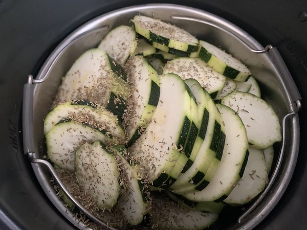 - Laver, éplucher votre courgette et la couper en rondelles, les disposer dans votre panier vapeur puis saupoudrer d’un peu d’herbes de Provence.
