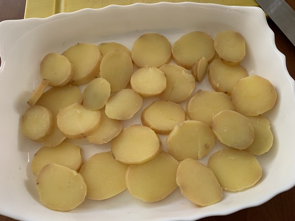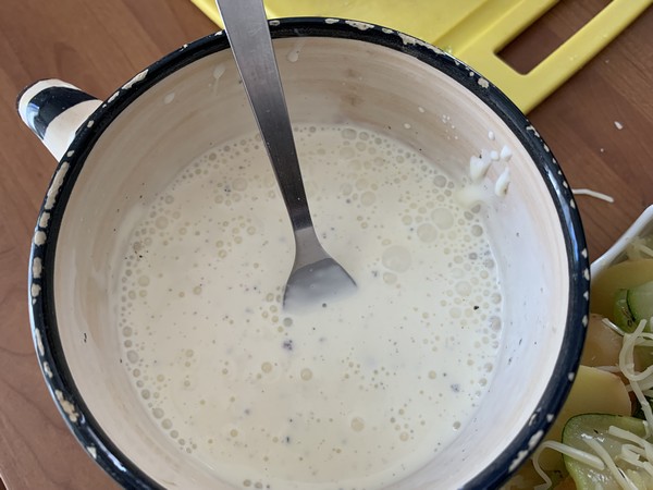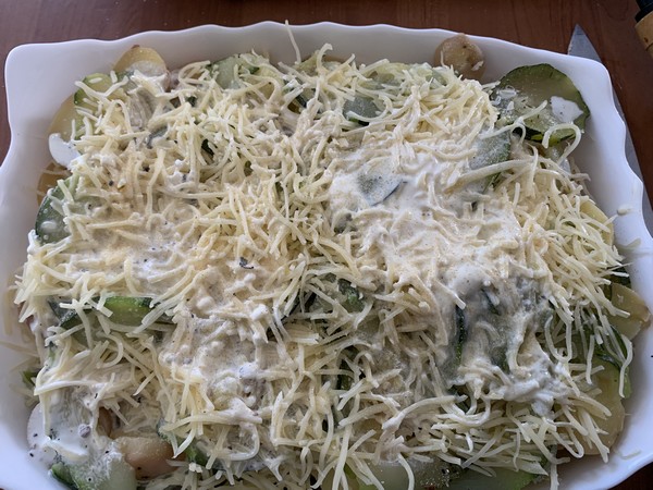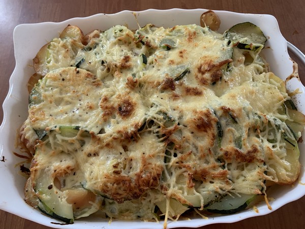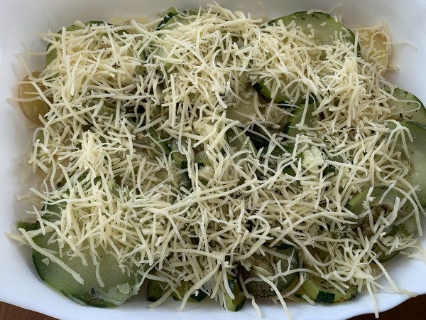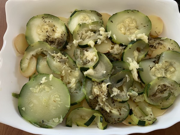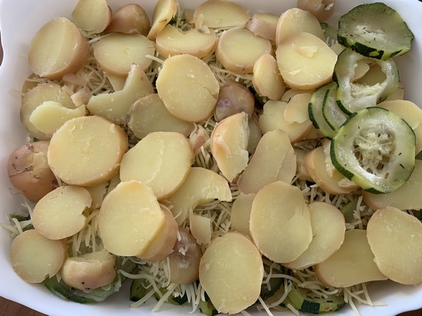 - Disposer dans un plat à gratin des rondelles de pommes de terre, recouvrir de rondelles de courgette, hacher la gousse d’ail et la parsemer sur le dessus recouvrir d’une fine couche de fromage râpé, puis renouveler une couche de pommes de terre, une couche de courgette, une couche de fromage.