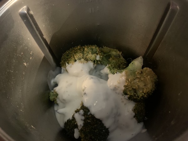 1. Lorsque les têtes de brocoli sont cuites, les mettre dans le bol du Thermomix, en garder quelques une pour mettre sur l’assiette.
