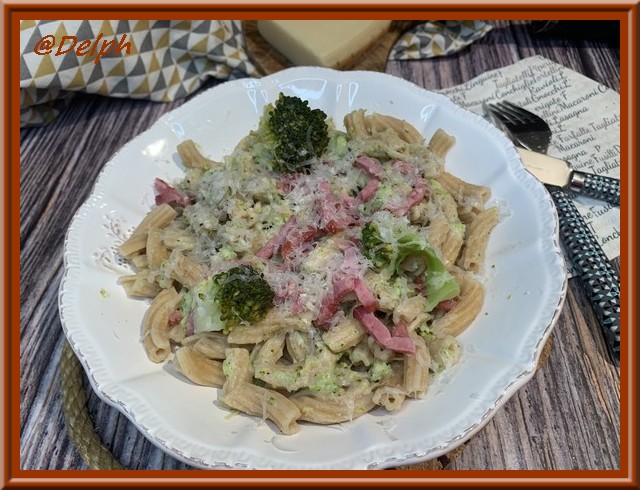 6. Dresser vos assiettes, en disposant vos pâtes égouttées, mélanger avec un peu de sauce, disposer sur le dessus des allumettes de bacon, des petites têtes de brocoli, et mettre un peu de parmesan râpé.