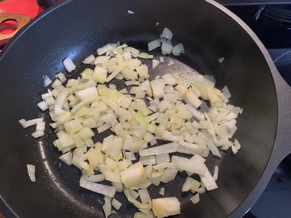 - Faire chauffer l’huile dans votre poêle et faire revenir l’oignon émincé et la gousse d’ail pressée.